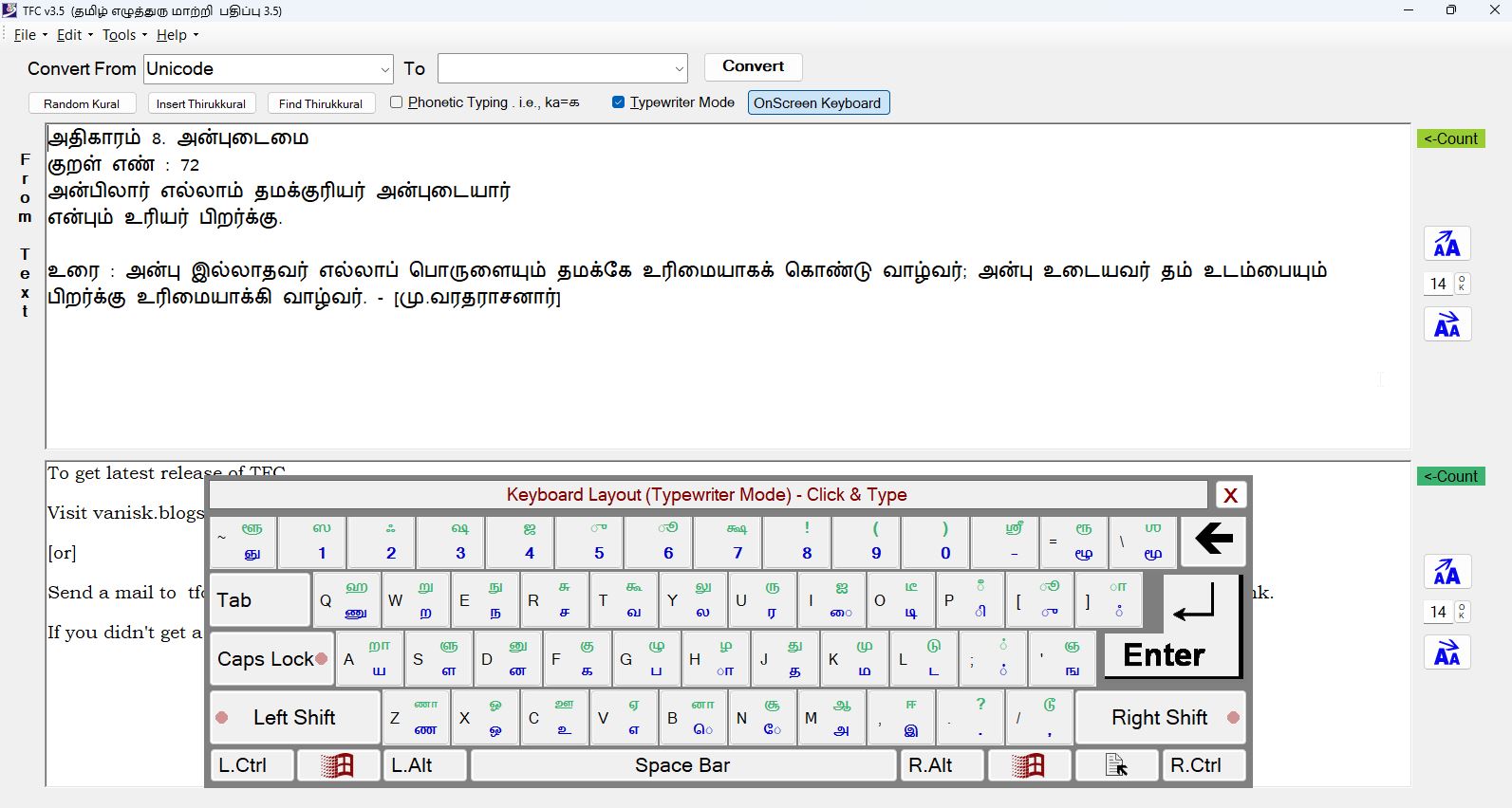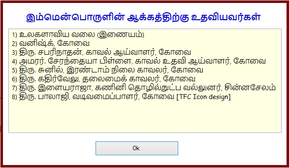 This is a portable Desktop application/software which is used to convert from and to 17+## familiar Tamil fonts [including Unicode]. There are 2 variants available now, one is based on Dot Net (Mainly for Windows users) and the other one is based on Java (for Linux, Windows and other OSs).